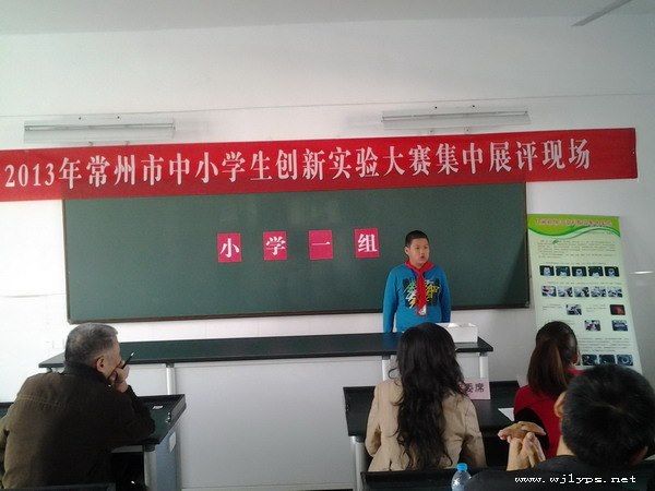 本次大赛分两大议程:上午选手参加比赛,下午举行表彰报告大会。常州市教育局局长丁伟明,常州市教育局副局长常仁飞,武进区分管副局长张世善,武进区教育局基教科和电教中心的领导一并参加了下午的表彰大会。上午六(2)班的唐家昊和六(9)班的谢家杰参加了比赛。他们分别向评委介绍了自己的创新实验,演示了实验过程,并接受了专家评委的提问,圆满地完成了比赛任务。因为我校开展创新实验活动时间较早,案例较多,所以科学办蒋仲良老师被选为辅导员代表,在大会上做了经验交流。他在会上介绍了学校开展创新实验活动的情况,并详细列举了几个实验案例,受到与会人员的一致好评。