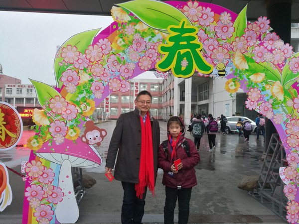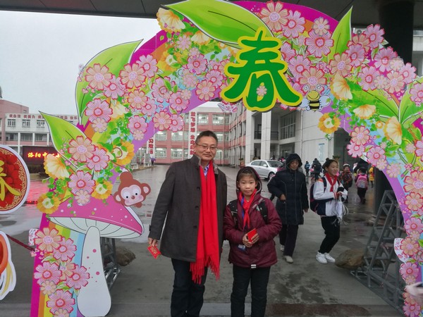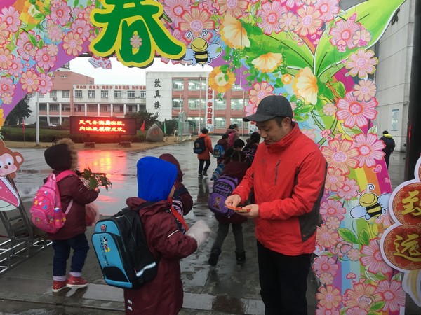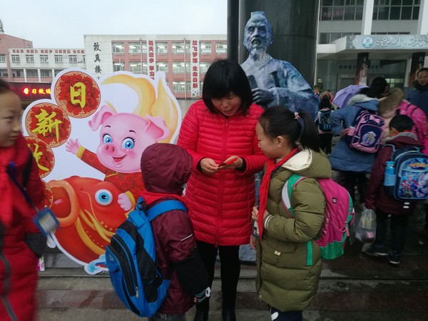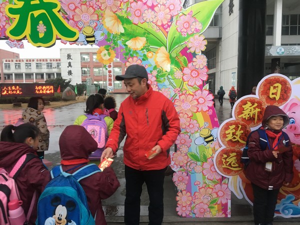 当新年的快乐还在萦绕、元宵的甜蜜即将来临时,孩子们就迎来了猪年的新学期。2月18日是武进区各中小学校正式上课的日子。一大早,洛阳中心小学所有校长老师在门口迎接同学们“回家”。看着孩子们欢快的身影、灿烂的笑容,看到了他们对于新年、新学期的憧憬,学校想送给他们一个特别而有意义的开学红包,给孩子们一个美好的开始。