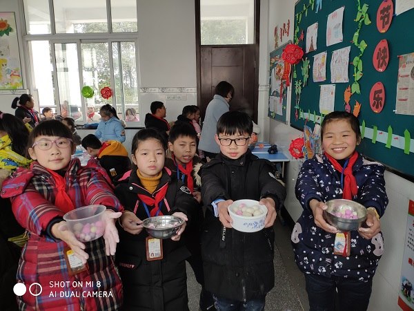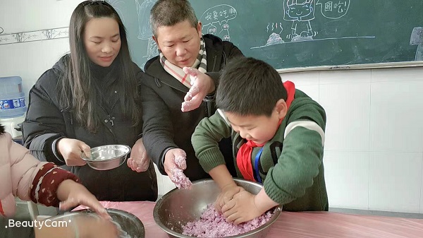 活动开始了,有的班级进行猜灯谜闹“元宵”,同学们穿梭其间,读着一则则有趣的谜语,你议我说,体验到了浓浓的民俗文化。有的班级一起赏灯,同学们畅游其间,自豪地向伙伴介绍自己的灯笼,大家评选着自己心目中最喜爱的作品。还有的班级在家长和老师的带领下亲手做起元宵,当一个个小面团分到各桌,队员们每人摘下一小块面团在掌心轻轻搓成圆团,一招一式有模有样。更有巧手家长带来五颜六色的面团,草莓面团、火龙果面团、蔬菜汁面团、香蕉面团……孩子们搓元宵、吃元宵,一个个大大小小的元宵诞生在手中,别提多开心了。 “吃元宵咯!”随着同学的吆喝声,同学们赶紧拿着碗,快速整齐地排队盛元宵。看着碗里五颜六色、形状各异的元宵,大家都一改平时大口吃饭的豪爽劲,而是小口慢慢品尝元宵的甜糯,细细体会自己的劳动成果。