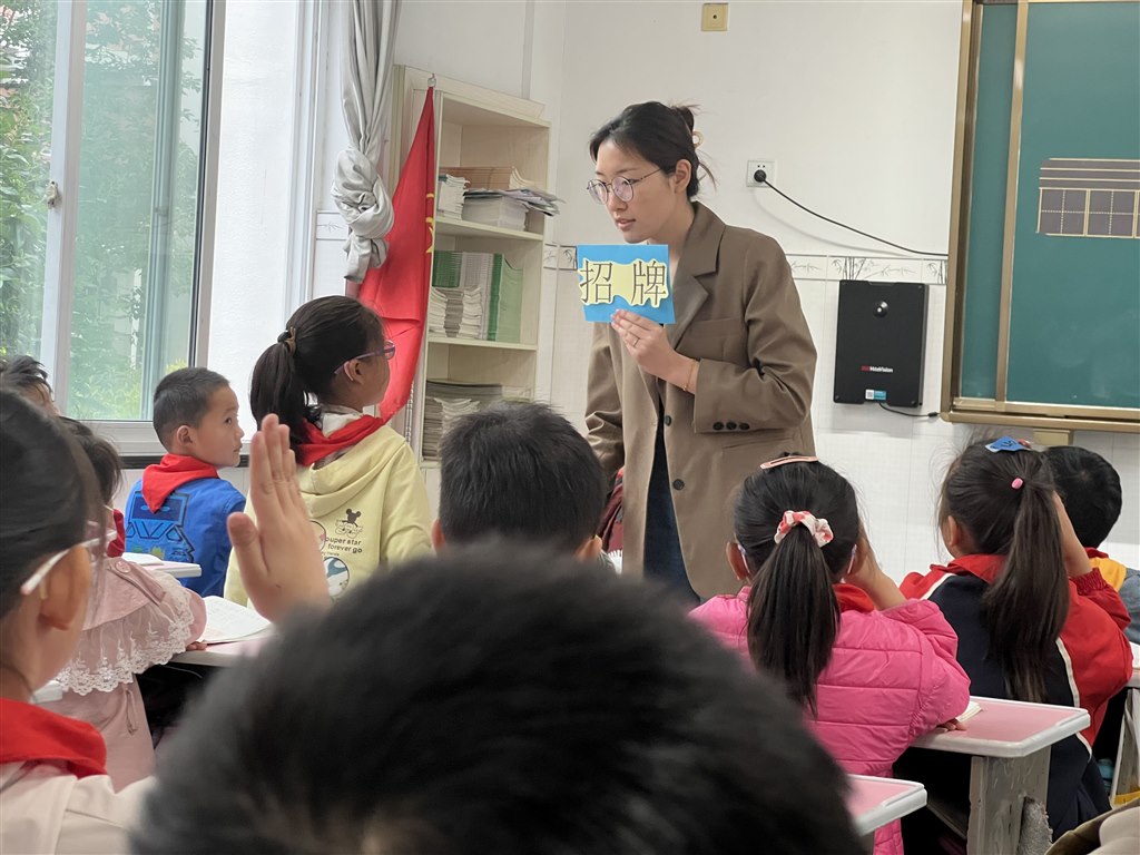 在执教《蜘蛛开店》时,唐老师先带领学生从生活中熟悉的“商店”导入,再引入课题,同时质疑课题,调动学生的积极性。与此同时,唐老师也注重字词教学,在掌握了生字词和书写后,她步步引导,层层深入,使学生理清故事脉络,同时,让学生结合板书用自己的话讲一讲这个故事,训练学生的表达能力。学生展现了良好的素养,听课状态佳、表达能力强。