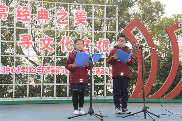 日新少年形象代言人美美——来自五7班的蔡安妮同学向大家介绍了本次美读节的活动内容:有主题板报评比,有主题讲座,有硬笔书法作品展,有经典摘抄作品展,有经典诵读专题校本教研活动,有迎新年赛诗会,还有经典诵读调研检测……丰富的活动让全体师生眼前一亮,更多了一份期待。
