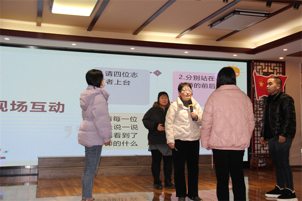 最后,戴教授邀请四位家长上台,分别站在她的不同的方位,请家长用描述性的语言而非评价性的语言说说观察到的自己。在一过程中教授家长们亲子有效沟通的方法——事实+感受+需要+请求,并通过案例和家长进行现场演练。