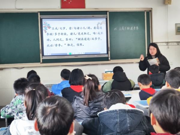 大家齐聚四(11)班,聆听了沈华芳老师执教的《王戎不取道旁李》。《王戎不取道旁李》是一篇文言小短文,故事性很强。沈老师以呈现读书锦囊的形式,将朗读训练贯穿于课堂学习的始终,从读准读通课文到读出节奏、读出形象,通过多种形式的朗读,学生感受文言文的韵味,最后尝试背诵,层层递进,步步深入。在读的过程中,沈老师引导学生借助注释、勾连旧知等方式理解词句,并聚焦重点文言字词“走”和“之”,让学生体会到文言文字词世界的奥秘。沈老师还重视生本课堂,以讲演结合的方式创设趣味环节,让学生参与到真实的情境中,加强了与学生的课堂互动。在形式多样的朗读训练、自主探究和拓展想象、故事讲述、表演中,学生自然而然地感悟了文意,体会了人物形象。整堂课中的教与学进行得扎实有效,既完成了教学目标,也教给了学生学习文言文的方法。