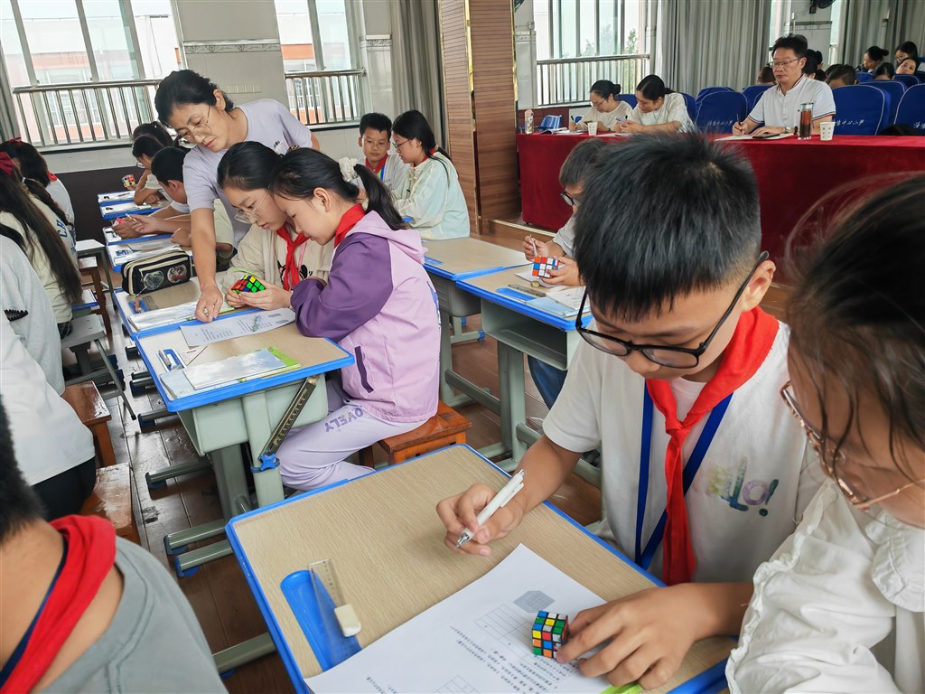 2025年9月30日,洛阳中心小学数学组举行了以《核心素养理论下致远课堂的实践探索》为主题的常州市高品质活动。六年级邹孝莉老师执教了一堂探究课《表面涂色的正方体》,洛阳中心小学全体数学教师参与听课,特邀专家蒋守成老师莅临指导并评课。本节课通过动手操作、观察推理、归纳总结等环节,引导学生从具体到抽象探索立体图形的涂色规律,展现了数学教学的思维魅力。