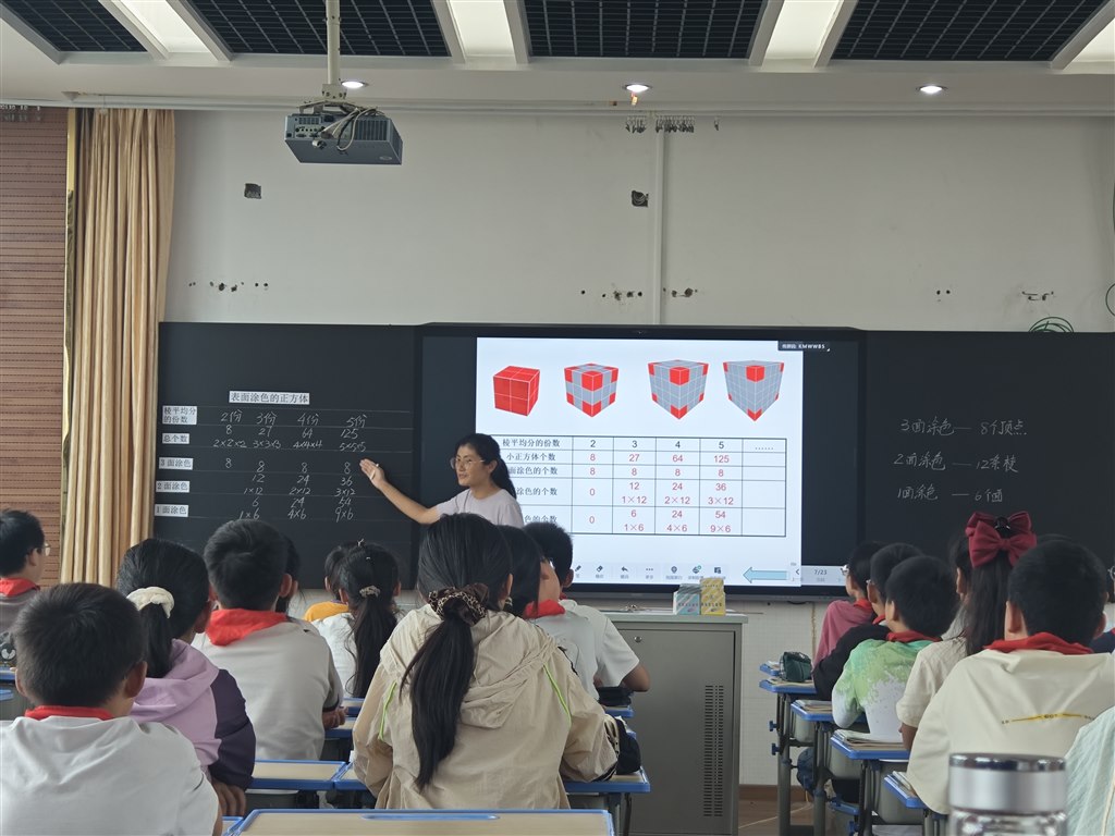教学中,邹老师注重引导学生从“位置—数量—关系”三维度构建思维模型,鼓励学生用字母表示规律,并延伸思考“不涂色小正方体的数量算法”,深化空间想象能力。学生通过小组合作、汇报交流,在“找—数—算”的过程中体验数学发现的乐趣。