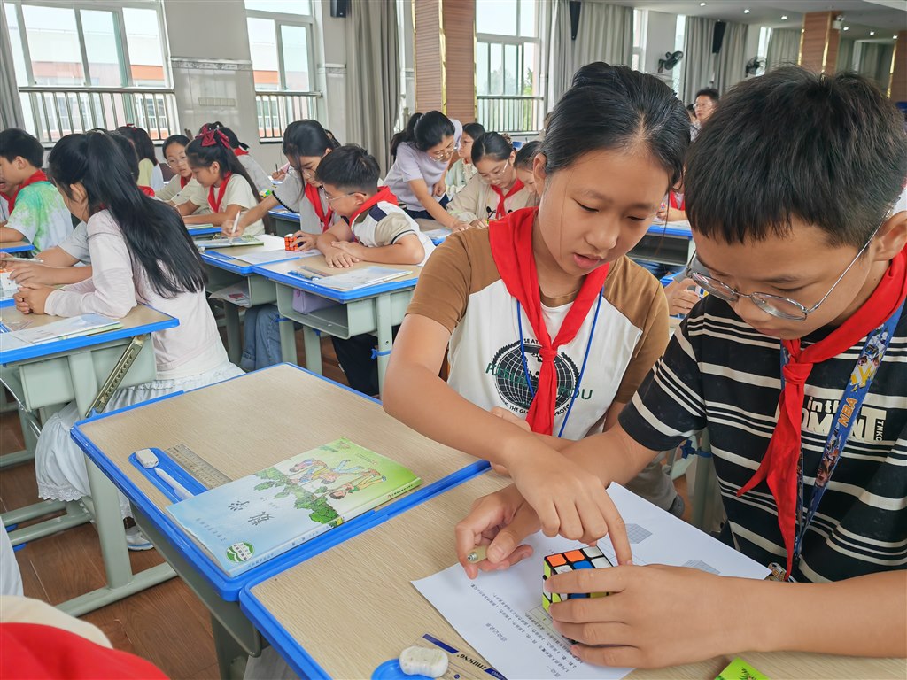 课堂伊始,邹老师以学生已学的长方体、正方体特征为切入点,提出“将正方体表面涂色后平均切割,小正方体涂色面数量有何规律”的核心问题。通过棱平均分成2份、3份的递进式探究,学生借助魔方直观操作,初步发现“3面涂色的小正方体位于顶点”“2面涂色在棱中间”“1面涂色在面中心”的规律。随后,学生自主探究棱平均分成4份、5份的情况,通过画图、计数、计算等方式,逐步总结出“3面涂色恒为8个”,“2面涂色数为12×(n-2)”,“1面涂色数为6×(n-2)²”的通用公式,其中n为棱平均分成的份数。