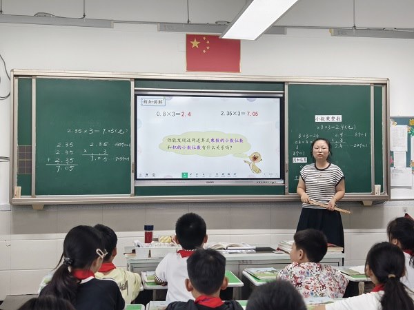 课一开始,李老师以“西瓜单价随季节变化”为情境引入新课,通过“夏天买3千克西瓜需多少元(列式0.8×3)”“冬天买3千克需多少元(列式2.35×3)”两个问题,自然衔接旧知与新知,引导学生发现“乘数含小数”的新算式特点,明确“小数乘整数”的课题核心。