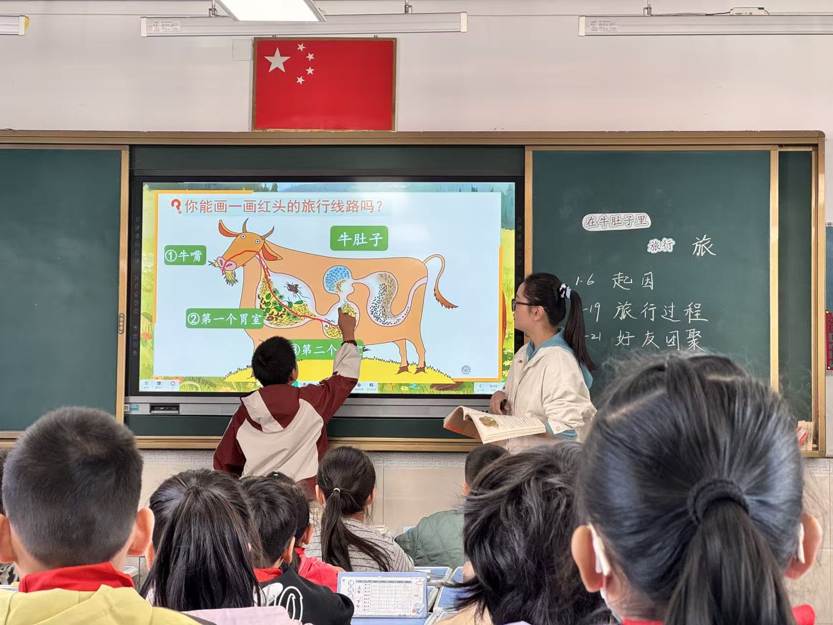 课堂开篇,王老师以 “旅行” 为锚点,先引导学生分享 “假期旅行中印象最深的场景”,激活学生已有生活经验;在生字认读环节,王老师针对多音字 “骨”(“骨碌” 读 gū,“骨头” 读 gǔ),设计 “想象场景辨读音” 游戏:“当红头在牛肚子里‘骨碌’打滚时,该读哪个音?如果它看到牛的‘骨头’,又该怎么读?” 通过想象具体情境,学生不仅掌握了读音规律,更在脑海中初步构建 “红头在牛肚子里活动” 的画面。针对教案中 “理清旅行路线” 的任务,王老师创新设计 “想象体验 + 可视化呈现” 活动:小组合作时,不仅要求圈画 “牛嘴→第一个胃→第二个胃→牛嘴” 的关键词,更需补充 “想象批注”——“在第一个胃里,红头会觉得冷还是热?”“从第二个胃回到牛嘴时,它会被什么包裹?” 学生带着想象批注画图,有的在 “第一个胃” 旁画 “发抖的红头”,有的在 “牛嘴” 处画 “沾着青草的红头”,让抽象的路线变成具象的想象场景。