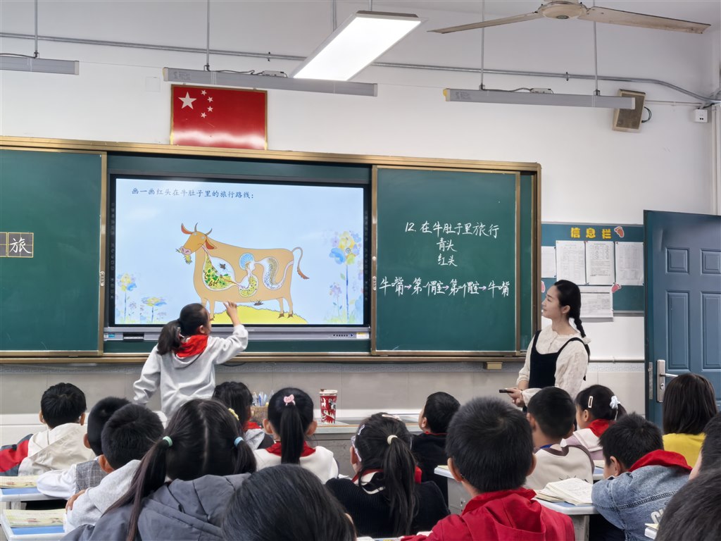 课堂上,虞老师以“一场奇妙的‘旅行’”为任务主线,设计了环环相扣的教学环节。导入阶段,通过创设“动物侦探社探秘”情境,引导学生猜测“谁在牛肚子里旅行”,迅速激发学习兴趣,自然引出文本核心议题。初读环节,明确任务要求学生梳理红头旅行路线,厘清“遇险—探险—脱险”的故事脉络,为言语表达训练奠定基础。 精读部分亮点频现。在“探旅行路线”环节,教师引导学生借助“先……接着……然后……最后……”的表达支架,结合文本细节清晰描述红头在牛肚的移动过程,锻炼有序表达能力;“品童话语言”环节,通过角色扮演、句式对比,让学生感受拟人化表达的趣味,同时渗透“抓住动作、语言写活角色”的表达方法;“悟科学知识”环节,结合“反刍”科普小视频,引导学生区分童话想象与科学事实,并用自己的话转述“反刍”知识,提升言语转化能力。