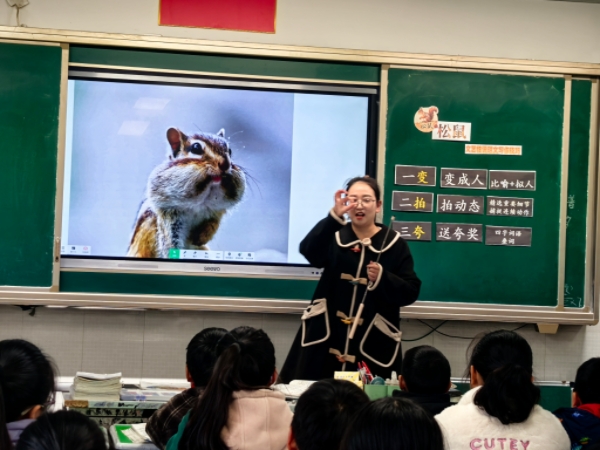 为帮助学生掌握文艺性说明文的写作技巧,沈老师设计了“解锁写作锦囊”的趣味活动,结合课文实例逐一剖析比喻拟人、精细动作连续描写、四字词语及叠词运用等技巧,并总结出“一变、二拍、三夸”的记忆口诀,让抽象的写作方法变得通俗易懂。在情境实践环节,她展示多幅松鼠图片,引导学生观察并进行片段创作,通过小组交流的形式充分调动学生的主观能动性,让学生在实践中体会写作乐趣。整堂课板块清晰、任务层层递进,沈老师注重建立民主和谐的师生关系,让学生在轻松的氛围中提升表达能力。