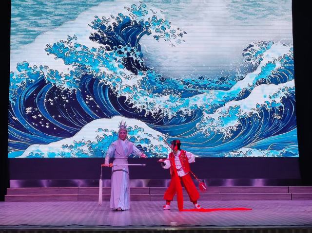 《闹龙宫》的金箍棒表演彻底点燃现场:演员手持金箍棒翻旋腾跃,棒影密如流星却毫厘不乱,当“花棒”招式收尾时,台下爆发出整齐的赞叹:“太厉害了!”连平日里对传统艺术“不太感冒”的同学也忍不住说:“原来戏曲这么酷!”