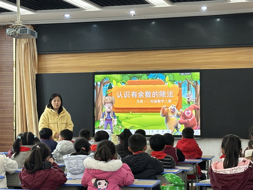 紧接着,潘立飞老师呈现了二年级研究课《有余数的除法》。课堂以“熊大熊二分蜂蜜”为情境,借助学具操作让学生直观感受“平均分后有剩余”的现象,逐步建立有余数除法的数学模型。通过层次分明的练习设计,进一步培养学生的数学思维与解决问题的能力。