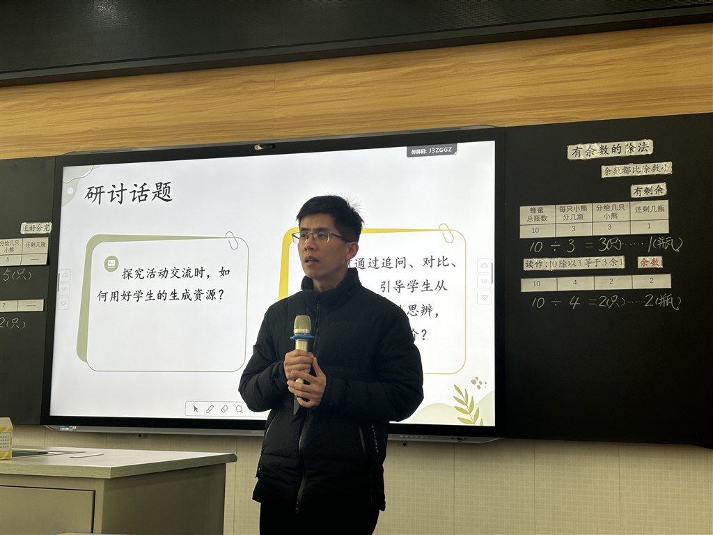 在课程评价环节,教师们一致认为《图形的拼搭》一课紧扣致远课堂理念,设计富有趣味,有效发展了学生的空间观念,建议可增加分工协作式任务以深化合作学习。随后,朱丹萍对《有余数的除法》进行了主题评课,系统阐述了本节课的教学目标——帮助学生建构有余数除法的概念,为理解“余数比除数小”奠定基础,实现从整除到有余数除法的认知跨越。他肯定了课堂中建模过程的合理性,以及教师将零散知识系统勾连、融入整体除法体系的做法,并赞扬了课堂氛围积极、准备充分、学生表现突出等优点。同时,他也指出应进一步放手让学生表达,充分利用课堂生成资源,增强小组交流与生生互动,真正把学习主动权还给学生。