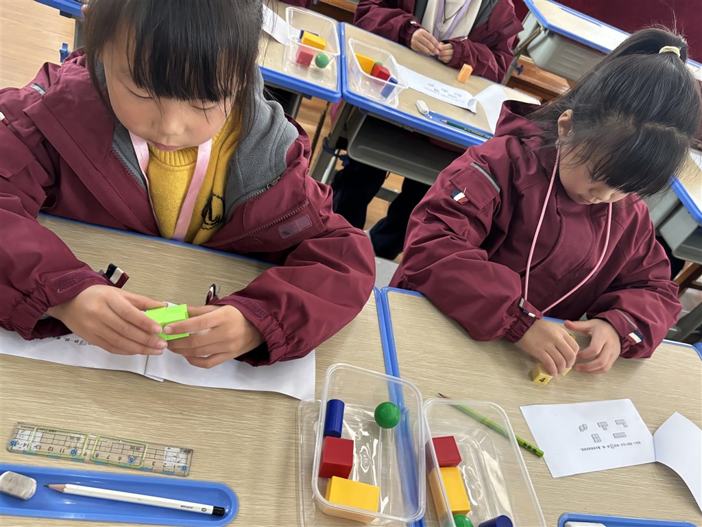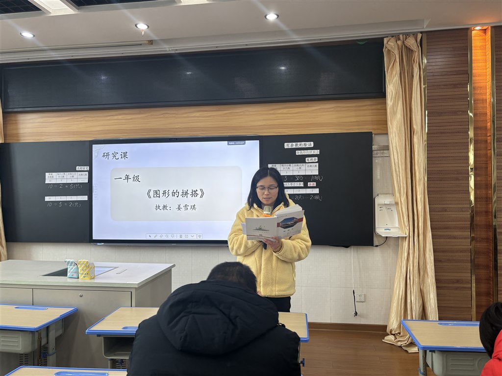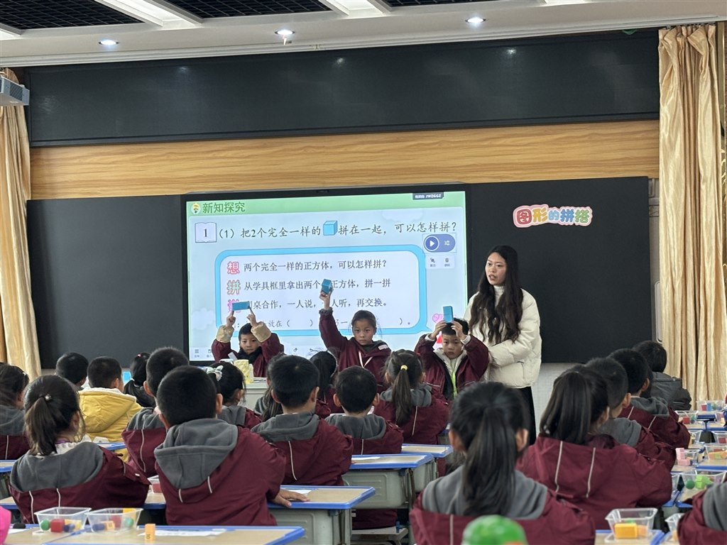 活动在严佳佳老师的主持下拉开序幕。首先,姜雪琪老师执教一年级研究课《图形的拼搭》。课堂以小猪佩奇的情境导入,引导学生通过不同数量正方体的拼搭活动,在动手操作中感知图形的组合与变化,逐步培养空间观念与实践能力。教学中注重学生的语言表达与合作交流,紧密联系生活实际,体现数学的应用价值。