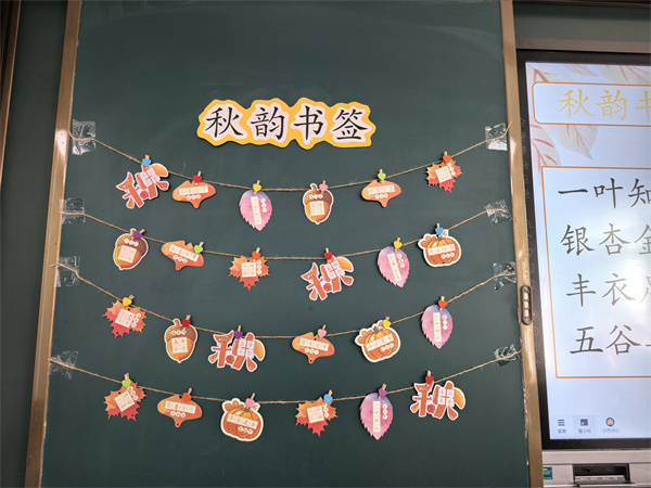 闯关成功后,学生们迎来“书签创写”终极大挑战。在朗朗儿歌的指引下,大家将课堂所学融入创作,把“五谷丰登”“丰衣足食”等秋意词语书写在书签上,配上工整落款,一张张满载墨香的秋韵书签新鲜出炉。展示环节中,孩子们争相分享作品,脸上洋溢着收获的喜悦。