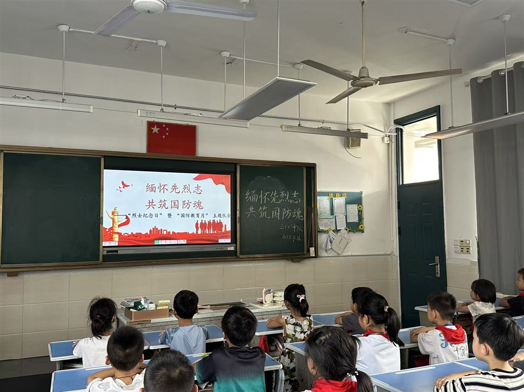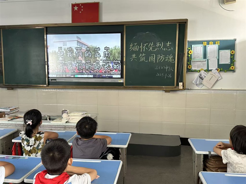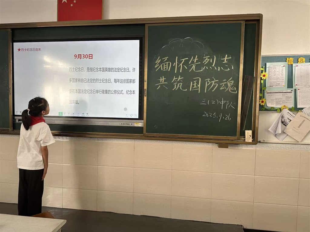 同学们在认真听班长读“烈士纪念日”的由来。