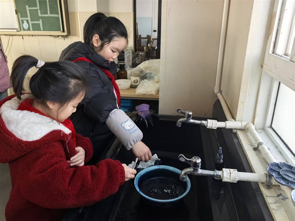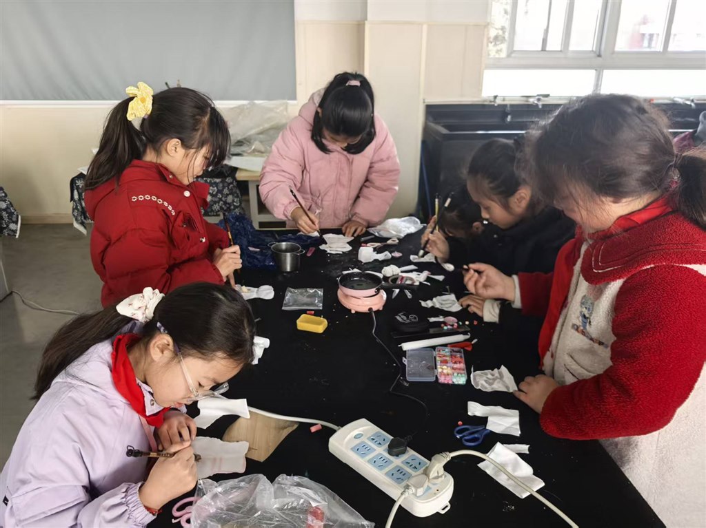 最具趣味的是蜡染体验环节,许老师将植物染中的蜡染技艺作为实践载体,先细致演示蜡染“绘图、染色、去蜡”的核心步骤,再指导学生动手创作。课堂上,学生们手持画笔、布料与蜡刀,大胆发挥创意,将青花瓷的经典纹样与植物染的独特质感结合,在布料上勾勒出属于自己的“非遗作品”。许老师穿梭在学生之间,耐心解答疑问、指导技法,让每个孩子都能沉浸在手工创作的乐趣中。