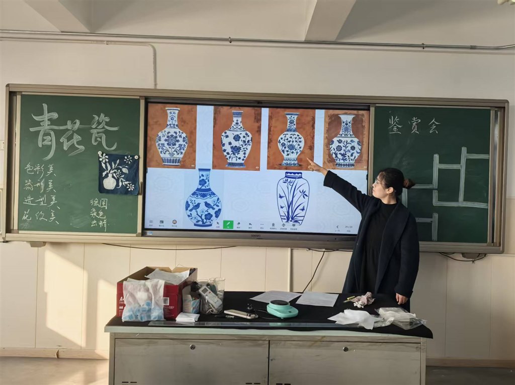 课堂伊始,许老师以青花瓷的蓝白美学为切入点,通过“China”与“陶瓷”的渊源讲解,引出中国传统工艺的美学内核,随即自然过渡到蜡染这一非遗技艺,让学生理解蜡染与青花瓷同为中华传统工艺的瑰宝,皆是古人智慧的结晶。在知识讲解环节,许老师条理清晰地拆解了青花瓷的器型美、造型美与纹饰美,结合对称剪纸小手工,让学生亲手感受传统美学中的对称规律;又通过主纹、辅纹的对比分析,讲解纹饰背后的文化寓意,让学生在审美感知中触摸传统文化的脉络。
