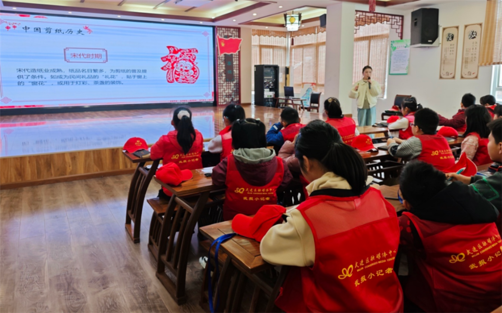 课程伊始,陈老师从剪纸的起源讲起,将这项国家级非物质文化遗产的历史脉络缓缓道来。她告诉小记者们,剪纸不只是装点生活的民间装饰艺术,更是老百姓传递美好期许的重要载体。每逢新春佳节,窗棂上、门楣间那一抹抹喜庆的红,便是最浓的年味、最暖的祝福。