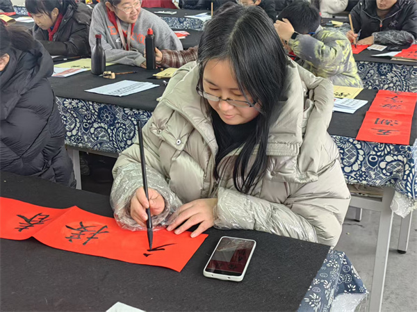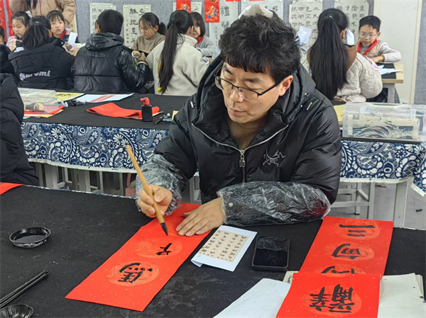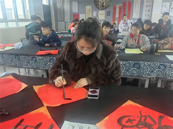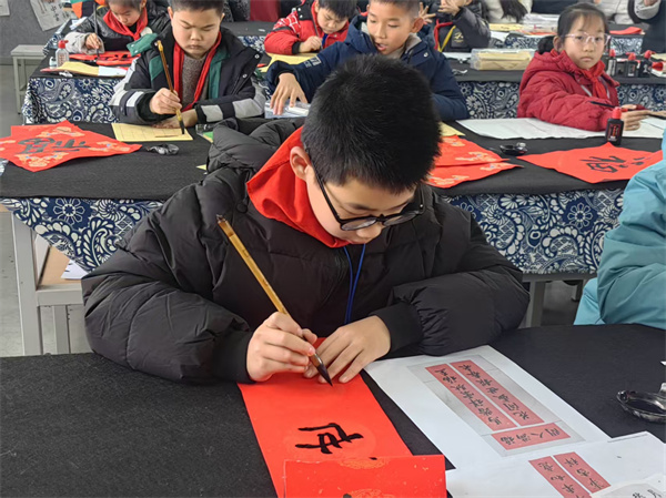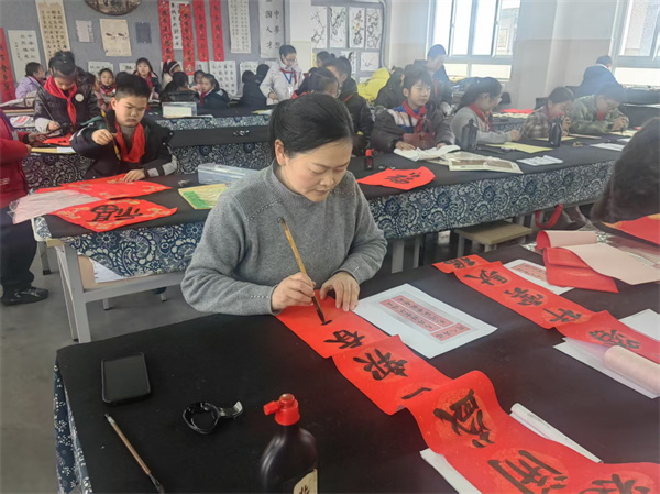 活动现场气氛热烈而温馨,师生们围在书桌旁,或静心观赏,或轻声交流心仪的联句。书法教师轮番上阵,学生书法爱好者也不甘示弱,纷纷提笔献艺。只见他们凝神静气,笔尖饱蘸浓墨,在大红纸上笔走龙蛇,一副副寓意吉祥、对仗工整的春联跃然纸上,既有对新春的美好期许,也融入了学校教育的特色元素。