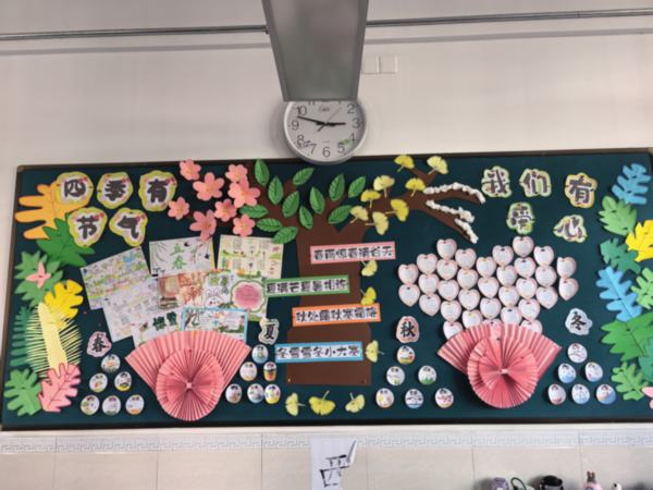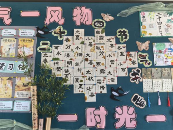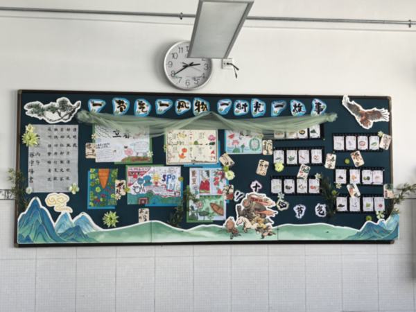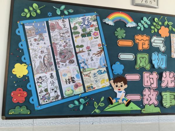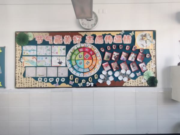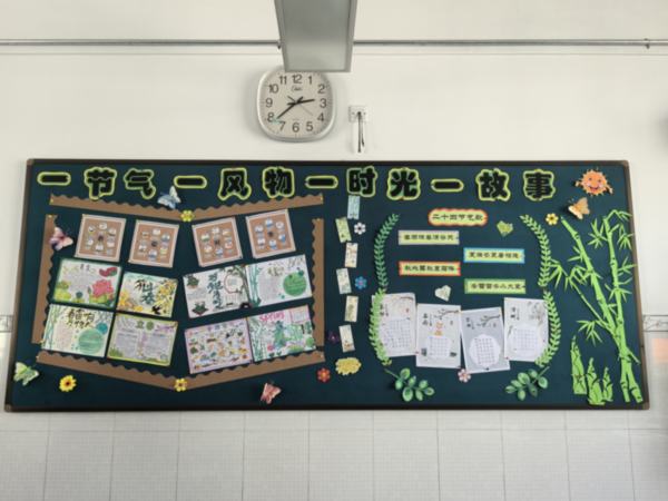 各年级结合节气文化主题设计、布置黑板报,展现师生创意与才华。低年级以“四季有节气,我们有爱心”为主题,版面活泼,通过“节气小百科”“爱心行动”等板块传递知识与善意;中年级围绕“节气藏美好,志愿传温情”,融合节气知识与志愿精神,兼具知识性与教育性;高年级以“一节气一风物,一时光一故事”为主题,融入节气风物、诗词典故,尽显文化底蕴。队员的书法、绘画、手抄报及实践照片融入板报布置,彰显特色,令人赏心悦目。