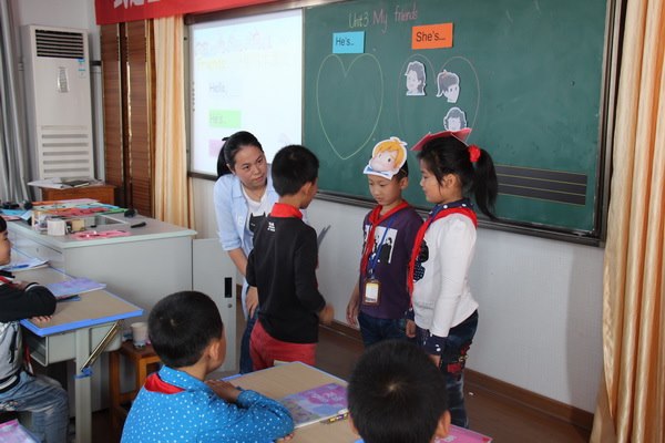 陆英老师执教的是三年级上册Unit3 My friends。陆老师运用了绘本故事中的人物Yellow和Blue,以为新朋友Blue和Yellow找朋友为主线贯穿全文。复习了以前学习的字母A-K,以及句型He’s ……/ She’s ……陆老师在这节课中充分利用绘本,结合适当的游戏渲染了浓厚的学习氛围,给学生以一定的情感教育。