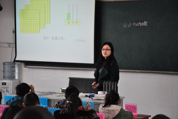 秦老师首先带领学生在具体直观的基础上学习数的组成,确立几个百是几百的概念,再引导学生通过拨珠、数数相结合的活动,让学生学习更大的计数单位“千”。秦老师整堂课环节清晰,目标明确,亲和力强,学生学习积极性很高。