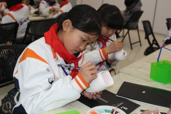 亲手制作瓷器是此次实践活动最大的亮点。十点整,队员们来到武进博物馆社教活动中心,在博物馆工作人员的安排下进行瓷器制作中最重要的“拉坯、捏泥、彩绘”实践体验。在手工老师指导下,队员们亲身参与到瓷器的制作体验过程中。一团黄白色瓷泥在拉坯机的转动中慢慢形成小碗,一个心形的小花盆、一团立体花瓣的堆砌捏制,展示了洛小日新娃们超凡的想象力和童真童趣。在对陶瓷素坯的绘制美化过程中,队员们更是用一道道五颜六色的七彩线条勾勒出他们对美好生活的畅想。队员们在形状不同的陶瓷素坯上绘制了荷塘月色、书写中华千古绝句、描绘海底世界等。两个多小时的认真创作过程,不难想象“陶瓷”对于洛小少先队员的巨大吸引力。