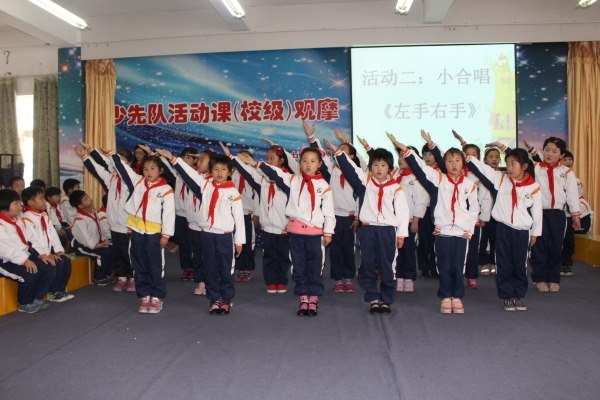 12:50分,嘹亮的队歌声响起来,两个由三(5)、二(12)中队精心准备的少队课活动正式开始。