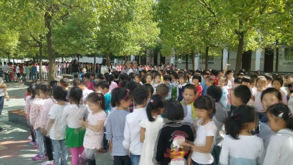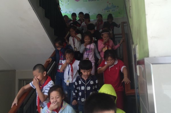 9月20日下午1:20分,正在全神贯注上阅读课的全体二学区师生在警报声响起之后,立即开始有序地撤离,“掩住口鼻、弯腰前行、有序、小跑”,一句句坚定有力的口令从各班主任口中发出,指导着学生撤离;到达安全场地后站队、清点人数、汇报情况,整个演习井井有条。